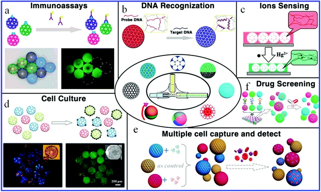 图5.球形光子晶体的生物医学应用(a)免疫测定; (b)DNA识别;(c)离子传感; (d)细胞培养; (e)多种细胞捕获和检测; (f)药物筛选。