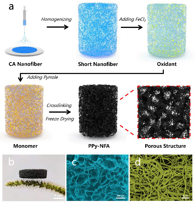 图1. 纳米纤维气凝胶制备流程示意图及相关结构表征。