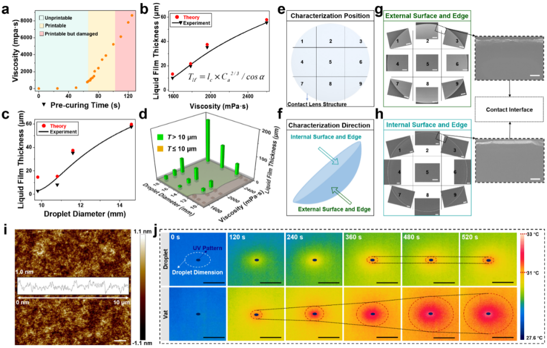 硅水凝胶由于其合适的含水量和透氧性被广泛应用于隐形眼镜结构的制备。该团队开发了一种可用于DLP 3D打印的紫外可固化硅水凝胶树脂系统用于隐形眼镜结构的制备(图1a)。在连续打印过程中,固化结构始终受到液体树脂和固化结构界面的限制,这使得薄液体树脂膜包裹在固化结构外。通过对受限液膜的控制,可以在不过度包覆的情况下填充相邻固化层之间的间隙,消除阶梯效应,获得侧壁光滑的三维结构(图1b)。