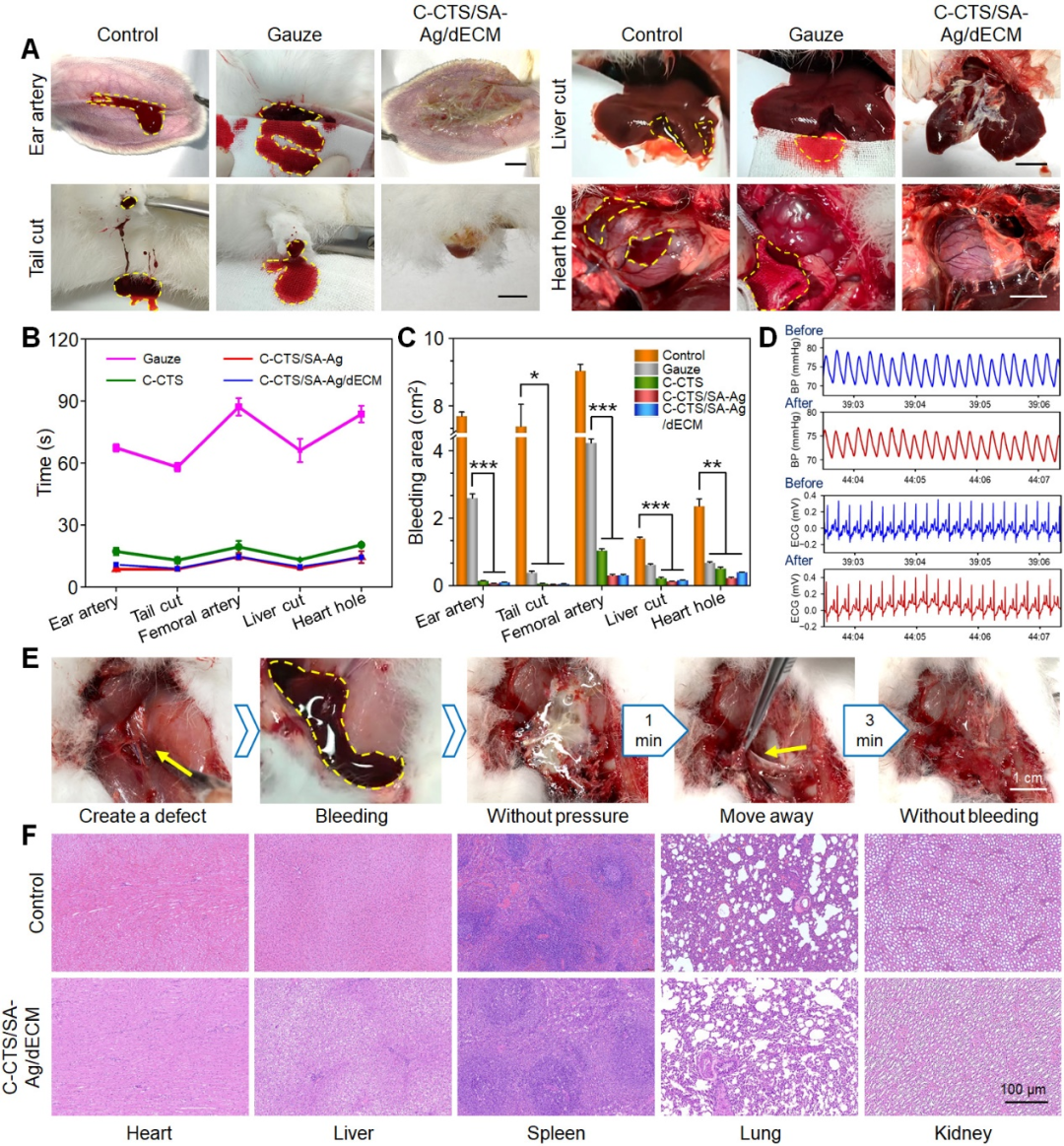 在重大事故或战场上,心脏/主动脉损伤会导致严重的失血,并在短时间内导致死亡。因此,开发一种具有高止血效率的新型敷料对快速终止出血具有重要意义。本研究建立猪股动脉和心脏穿刺出血模型,进一步评价C-CTS/SA-Ag/dECM水凝胶在大规模致死性出血情况下的止血能力。图7A和7B显示,双仿生止血水凝胶在没有施加任何外力的情况下,实现对猪心脏/股动脉的止血效果,所开发水凝胶为临床开发非加压止血试剂提供了新的思路。考虑到,不规则形状的小而深的伤口通常属于最大剂量的出血模型之一,如战场上的枪伤和临时装置爆炸引起的腔室出血。研究人员利用市售聚乙烯醇(PVA)海绵具有良好的吸水和膨胀能力与双仿生水凝胶相结合,构建了一个致命的猪锁骨下动脉出血模型,以验证水凝胶-海绵复合材料对深层和狭窄伤口的止血效果。如图7I所示,在保证止血效率的情况下,复合材料的使用量仅需纯PVA海绵组的一半。这种双仿生水凝胶与PVA膨胀海绵的结合,最大限度地结合了化学和物理止血的优势,为非压迫性深部伤口的急救治疗提供了新的启示。