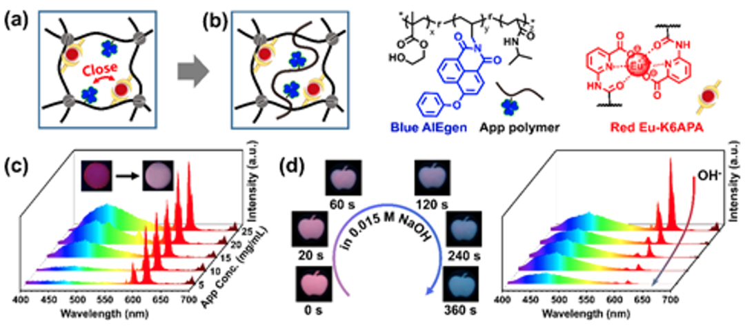 智能荧光高分子水凝胶是一类发光性能可调的高分子软材料,其三维交联网络中包含大量水分子的独特结构特点,使其可兼具经典荧光材料和高分子水凝胶的共同性能优势及两种材料集成后可能衍生出的新性能,在传感检测、信息防伪、仿生驱动、软体机器人等应用领域得到广泛关注,是先进发光高分子材料领域的重要发展方向之一。目前,智能荧光高分子水凝胶多是通过两种或多种荧光团的物理共混或无规共聚合等方法来制备,存在变色范围窄、功能单一等问题。