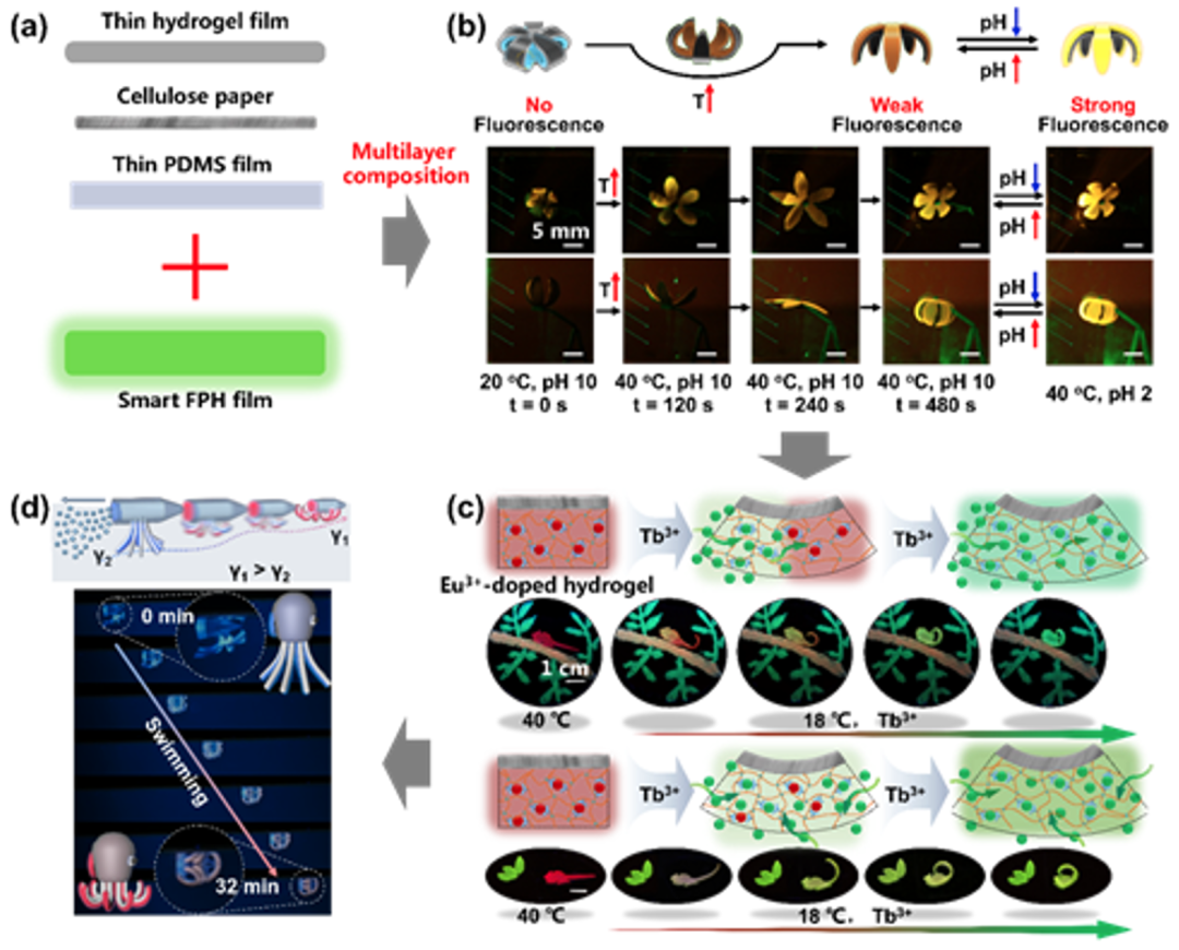 图3 多材料非对称界面复合构筑的仿生荧光变色、三维变形或定向运动等多功能协同仿生智能高分子水凝胶驱动器及软机器人