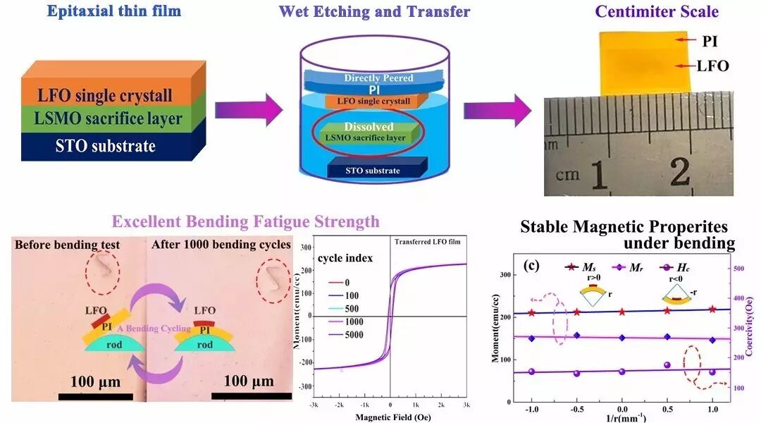 近日,西安交通大学贾春林科学家工作室功能氧化物薄膜研究组利用薄膜湿法转移技术在柔性的聚酰亚胺衬底上制备出厘米尺度的高质量LiFe5O8外延单晶薄膜并研究了其磁学性能。研究表明采用该方法转移的薄膜具有较高的结晶质量,并能够良好地保持其原位生长时所具有的结构与磁学特性。该薄膜具有优秀的柔性和弯曲疲劳特性,在经历数千次弯曲后仍基本保有最初的磁学性质。同时,即便保持在不同的弯曲状态下,薄膜的各项磁学性质变化仍在10%的范围之内,具有良好的稳定性。该项研究结果将对在柔性衬底上制备更多种类其它高质量单晶氧化物薄膜提供了重要的实验途径。