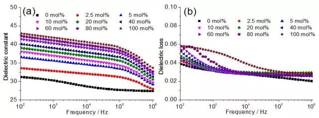 对聚乙炔链段掺杂不同含量的碘单质,来调控纳米导电域的电导率,研究其对“分子复合物”介电性能的影响。在未掺杂碘单质时,共聚物的介电常数在100Hz时为31,当掺杂聚乙炔摩尔量2.5%的碘时,介电常数增加到33.5;随着碘含量提高,介电常数继续增加并随着碘含量的增多而变缓。掺碘量低于60%,介电损耗在100 Hz频率下仅从0.04增加到0.05;当掺碘量超过60%,介电损耗在102-104 Hz处明显增大(图4)。