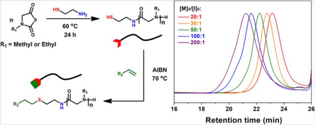 近年来浙江大学高分子系凌君教授课题组连续报道了N-取代甘氨酸N-硫代羧酸酐(NNTA)可控开环聚合制备聚类肽的工作,发现NNTA单体拥有更好的稳定性,对水和未活化的羟基都有很好的耐受性(Macromolecules 2014, 47, 6173; Polym. Chem. 2015, 6, 3164; Macromolecules 2017, 50, 3066; 高分子学报 2018, (1), 72)。