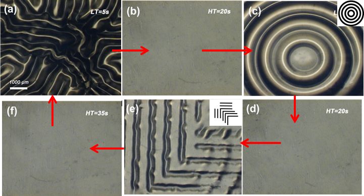 在理论研究上,该研究工作通过化学交联反应对薄膜材料应力调控的策略,实现了褶皱图案在二维方向上的长程有序化;在应用方面,与传统光刻技术相比,该方法可以一步得到图案,无需后处理工序,简单经济快捷,可适应性广,突破了传统光刻繁琐的工艺限制。同时,光敏聚合物易于设计性和多样化可以实现从宏观尺度到微米级,亚微米级甚至纳米级有序图案的制备。进一步,蒽基团的可逆交联反应可以动态调控应力场的释放和产生从而实现表面图案的循环擦写,在信息存储和防伪、显示、可重构材料及柔性电子器件等有着潜在的应用(图3)。