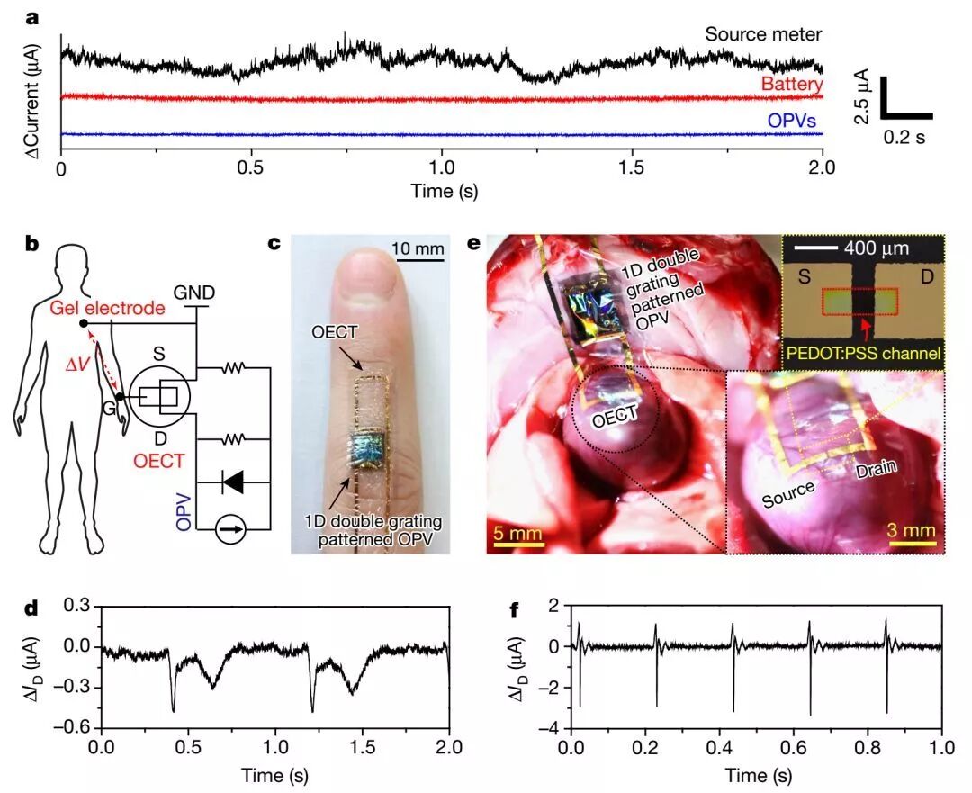 小白鼠活体测试表明,在LED的连续光照下,器件可实现对心脏心率信号的实时精准监测,灵敏度是常规能源驱动的OECTs的3倍以上。这主要是因为,没有外部功能之后,避免了外部连接导致的信号波动。