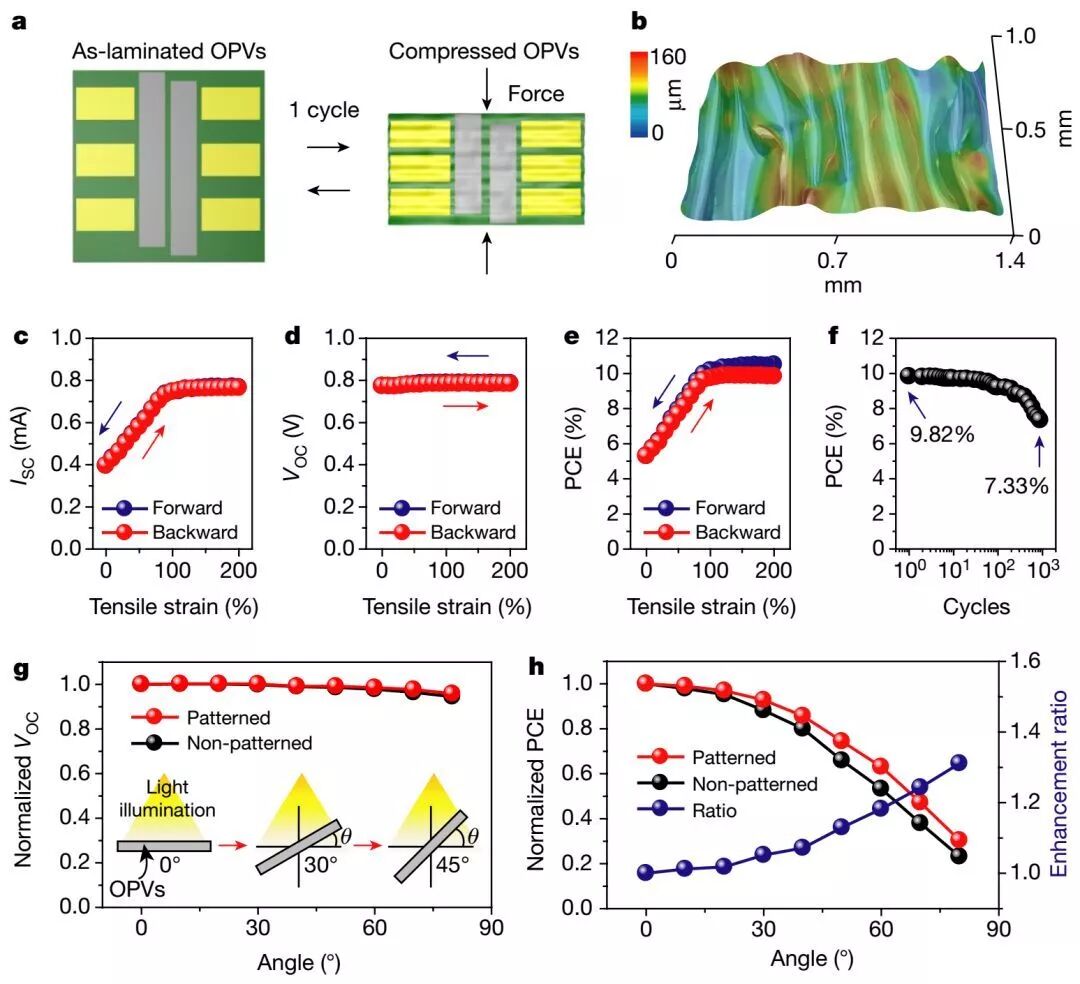 力学变形导致电学性能不稳定,是柔性电子器件面临的普遍问题。该研究中,研究人员利用OPV的超薄特性将器件黏合在预拉伸的橡胶材料上。研究发现,器件不仅可以在应用在曲面,还能被拉伸2倍长度而不造成电学性能损失。即便是900圈拉伸松弛循环测试之后,器件效率仍可保留75%。