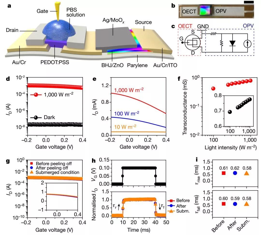 研究人员以经典的超薄聚对二甲苯作为基底,在此之上集成OPV(有机光伏器件)和OECTs(有机电化学晶体管)。聚对二甲苯是一种完全线性的高度结晶结构的材料,采用独特的真空气相沉积工艺制备,致密无针孔、透明无应力、不含助剂、不损伤工件、有优异的电绝缘性和防护性,是目前最有效的防潮、防霉、防腐、防盐雾涂层材料之一。