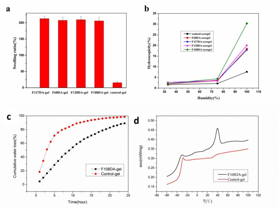 图3. (a)四种普朗尼克凝胶与对照组凝胶的溶胀率; (b)不同湿度下四种普朗尼克凝胶与对照组凝胶的吸湿率; (c) 40℃下对照组凝胶与F108DA凝胶的累积失水量; (d) 对照组凝胶与F108DA凝胶的DSC图