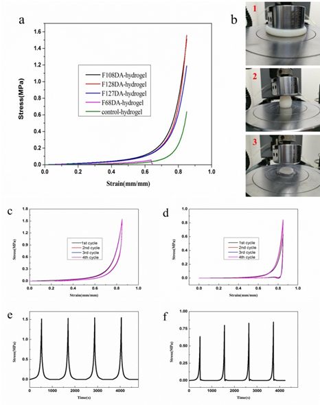 四种普朗尼克凝胶在湿态下表现出优异的形变回复能力以及弹性。在压缩应变达为85%时,应力能达到1.5兆帕,并且在应力释放后能够回复到初始的状态。在循环压缩测试中,普朗尼克水凝胶具有良好的抗疲劳性,而对比对照组凝胶,在循环压缩过程中,由于水分的流失,其机械性能出现了不稳定性。