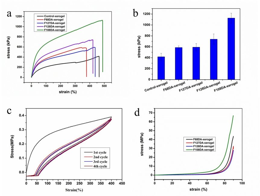 图5. 普朗尼克干凝胶与对照组干凝胶的(a)拉伸应力-应变曲线以及(b)对应的拉伸强度; (c)F108DA干凝胶在伸长率为400%下的应力应变曲线; (d)普朗尼克干凝胶在压缩应变为90%时的应力-应变曲线