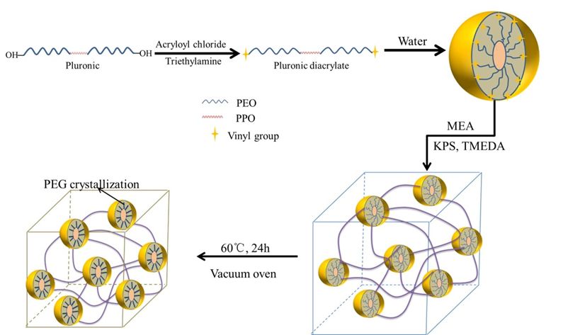 图1. 由双键修饰的普朗尼克胶束交联的水凝胶和干凝胶示意图