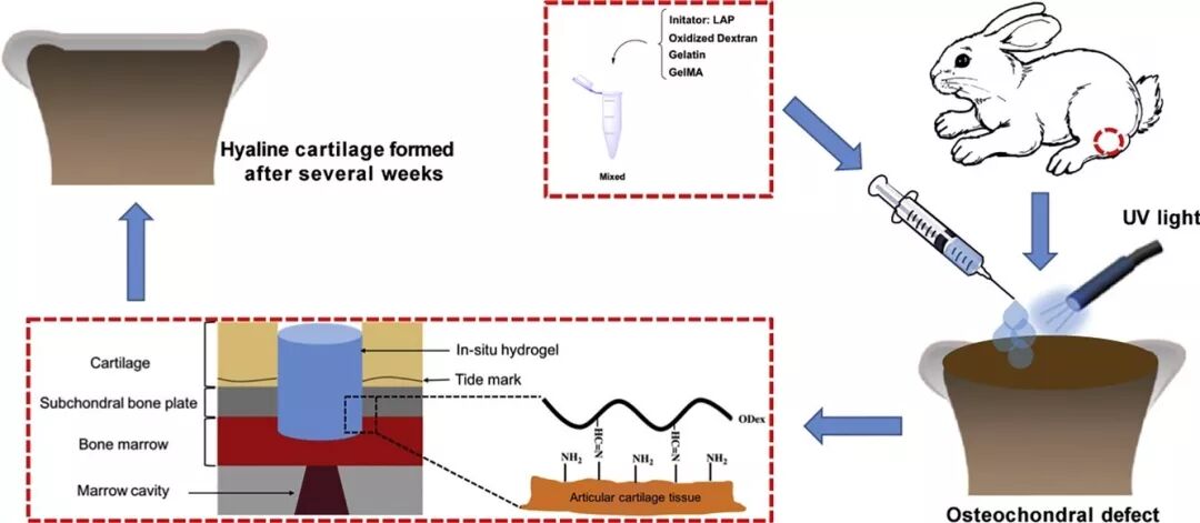 浙江大学医学院欧阳宏伟教授课题组针对这一问题,制备了一种具有原位成型并和组织无痕整合特性的水凝胶(M-O-G),能够更好修复骨软骨缺损。