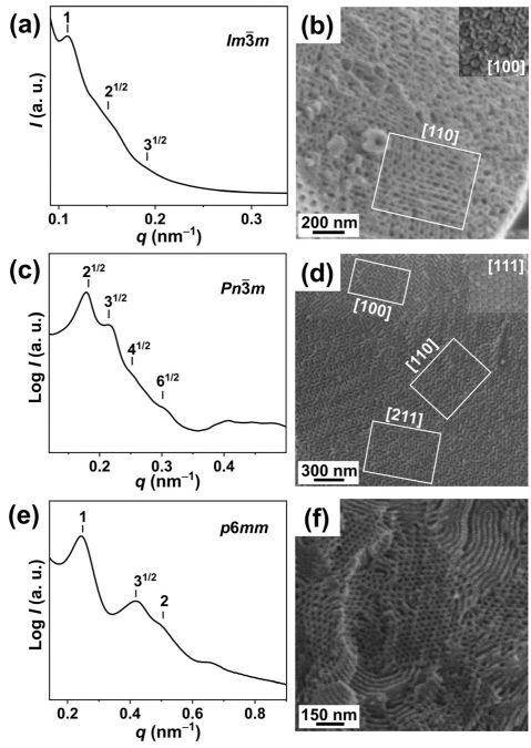 图3. 不同样品在THF和H2O中组装的SAXS图及截面SEM图(a, b: E45M41组装得到的Imm聚合物立方晶; c, d: E45M50组装得到的Pn