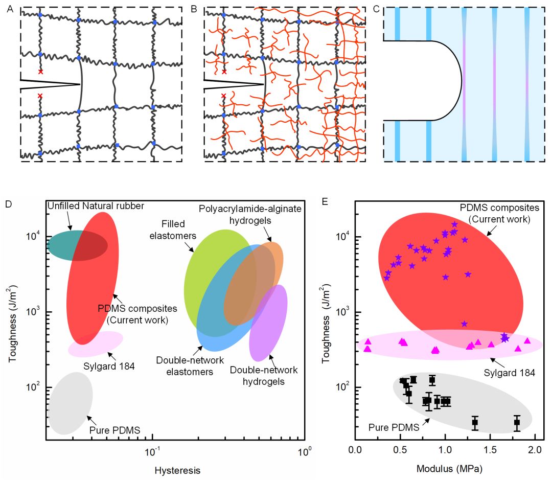 柔性可拉伸材料(高弹体、凝胶等)在可拉伸电子器件、软体机器人、药物释放和组织再生等领域有着广泛的应用前景。大多数应用场景需要可拉伸材料具有低滞后性和高韧性--即材料在正常工作范围内的拉伸和恢复过程中耗散较少的能量,当出现裂纹时在裂纹尖端区域耗散较多的能量以阻止裂纹的扩展。但是,材料的韧性和滞后性通常具有正相关性,从而不能同时满足以上要求。单一聚合物网络具有低滞后性和低韧性(图1A)。目前常用的增韧策略是在第一层主网络中添加填充颗粒或第二层弱聚合物网络以引入牺牲键来提高其韧性(图1B)。但这种方法会显著提高其滞后性,从而使其无法应用到软体机器人、传感器和制动器等器件中。并且不管引入的牺牲键是否能自修复,这一类韧性材料的疲劳阈值都远低于其断裂韧性。