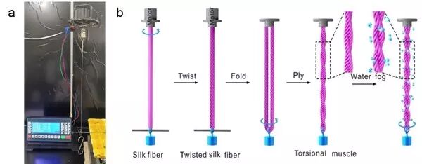 刘遵峰教授团队利用天然纯蚕丝制备了一种新型的“人工肌肉”纤维,不使用化学修饰和添加剂,通过脱胶、加捻、合股、热定型等常规工业流程制作获得。蚕丝“人工肌肉”在水雾和湿度驱动下实现了扭转、拉伸和收缩致动。为了不需要外界固定就能实现可逆驱动,刘遵峰教授团队开发了一种扭矩平衡的纤维结构,通过将扭曲的纤维对折、合股,使得蚕丝纤维实现了自平衡。