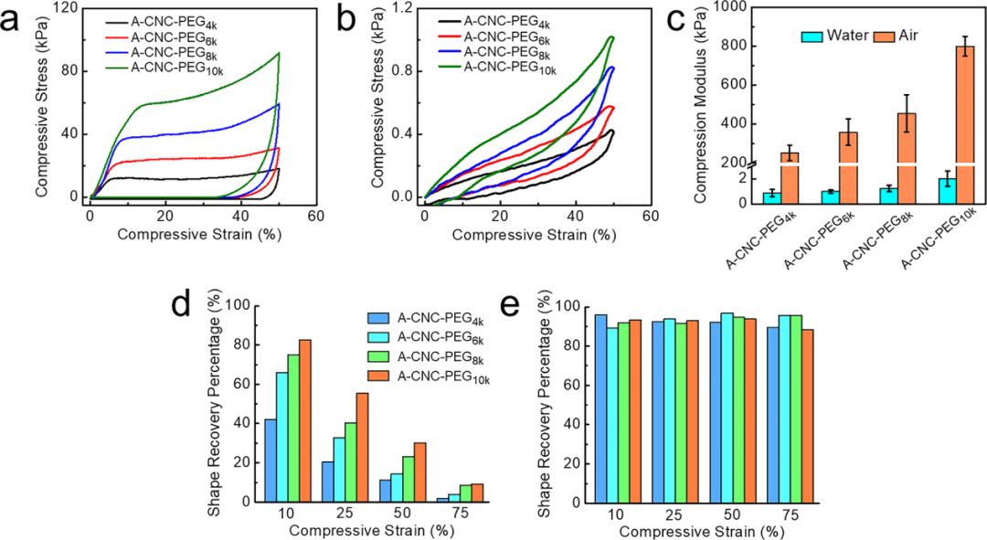 图2 具有不同分子量PEG的气凝胶在(a)空气中和(b)水中的应力应变曲线;c)在空气和水中的压缩模量;d)在空气中和e)水中的形状恢复率。