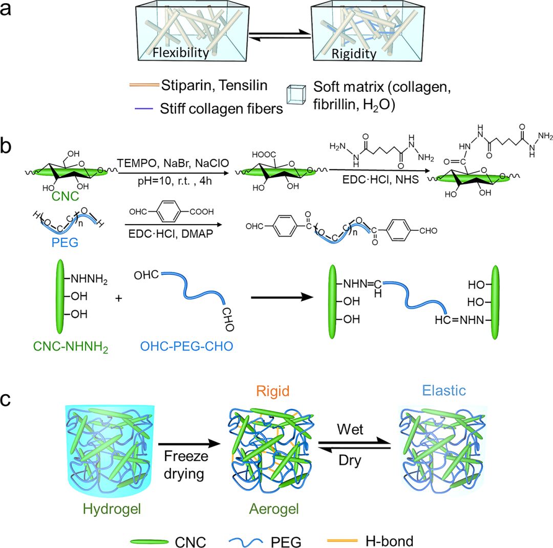 图1 a)海参皮肤的刚柔转变示意图。b)CNC基气凝胶化学交联示意图。c)气凝胶刚柔转变示意图。