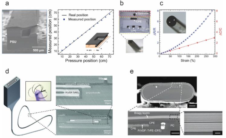 用于应变传感的可拉伸柔性纤维应用广泛。一方面,它需要在特定的结构中实现导电材料和绝缘材料的组装;另一方面,它也在向实现关于可拉伸或柔软纤维的热拉伸工艺发展,但是由于材料的流变性能,这也成为了一项挑战。人们对此类纤维的开发越来越感兴趣,电子纤维产品展现了符合人类皮肤、生物组织、柔性机器人和织物的能力。