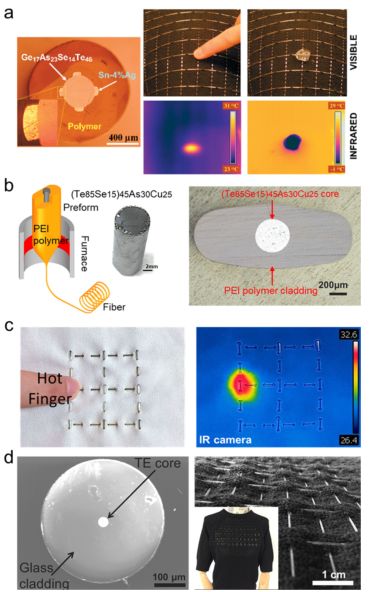 热传感器揭示了许多化学、物理和生物现象动态的重要信息,是工业加工、医疗诊断和军事防御中最常用的传感器之一,如图6所示。用于热传感、定位和制冷的纤维可以进一步织成织物,这使得它们特别适合应用于绿色建筑、工业能源管理、可穿戴电子设备、智能织物和大面积可持续能源生产系统。