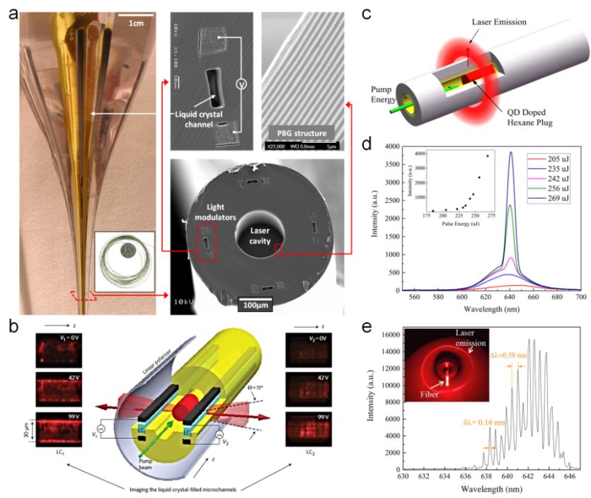用于调制激光发射的电子纤维,可用来制作一种纤维轴横向平面的圆柱对称激光发射的全向激光器,在全向成像、生物医学检测和光动力治疗等方面具有重要的应用价值,因为它提供了一个比普通光纤更大的激光发射表面积。新型激光材料的研究正引起人们极大的兴趣,并为下一代全光纤光子系统的发展提供了广阔的前景。