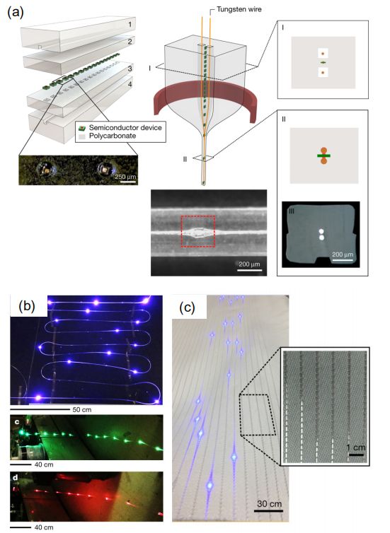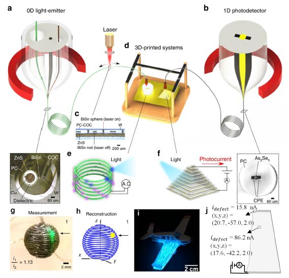 此外,多材料纤维还可以作为3D打印的墨水,可以将具有不同物理性质的材料很好地结合在一起,打印到器件中(如图12)。通过这种方法,可以构造出任何形式的三维结构来展示设备的功能。