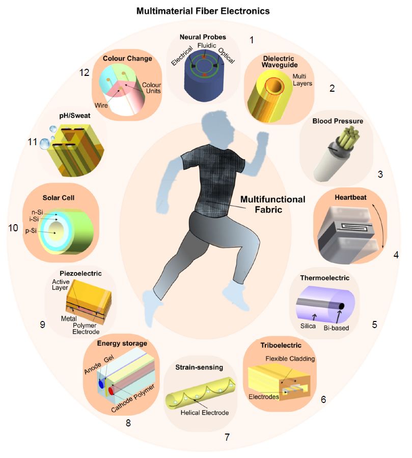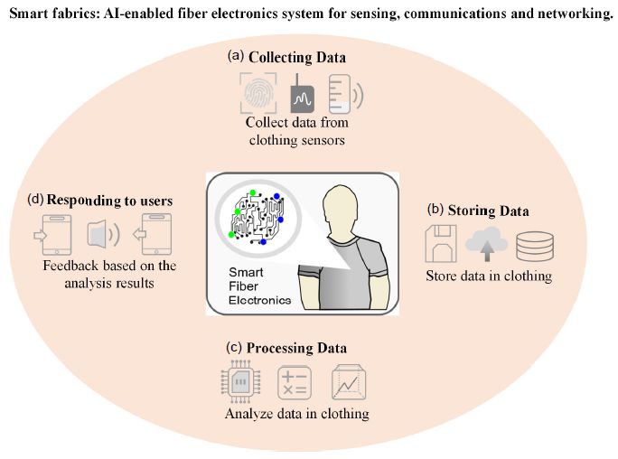 织物无处不在,但它们的功能几千年来一直没有改变。将多材料纤维与电子织物结合,主要包括电子纤维直接集成,或者是其他典型技术如电子设备嵌入织物衬底、直接功能化纺织表面等。此外,智能织物与人工智能(AI)相结合,电子纤维和织物可能演变成更智能的系统,具有强大的数据处理和分析能力。与刚性设备相比,采用智能面料技术的织物使数据采集过程更透明、更准确,数据质量更可靠、更真实。