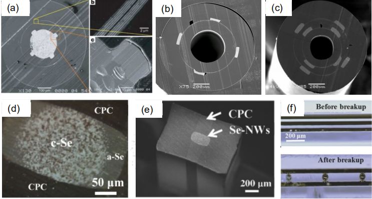 经研究发现用于光敏的光电子纤维中薄膜结构光纤的灵敏度要优于固态芯光纤。由于最初半导体芯均为无定形的,但无序的原子结构对器件的电子和光电子性能是有害的,于是通常采用不同的退火策略来改变半导体原子结构,如对非晶芯直接进行热退火,激光加热,利用化学溶液中的相变等,图8展示了不同工艺制备出的光电子纤维。