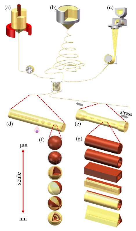 制备集成多材料和复杂结构的光纤电子纤维器件在工艺上具有挑战性。以热拉制为核心的典型工业生产方法应运而生。文章列出了热拉制纤维历史发展的代表性作品。此方法集成了具有不同光学、电子和光电子特性的不同材料,在宏观预制棒内设计结构,然后通过将预制棒热拉制成纤维,使纤维保持预制棒的复杂结构和和功能,从而得到具有高密度器件和各种功能的纤维。