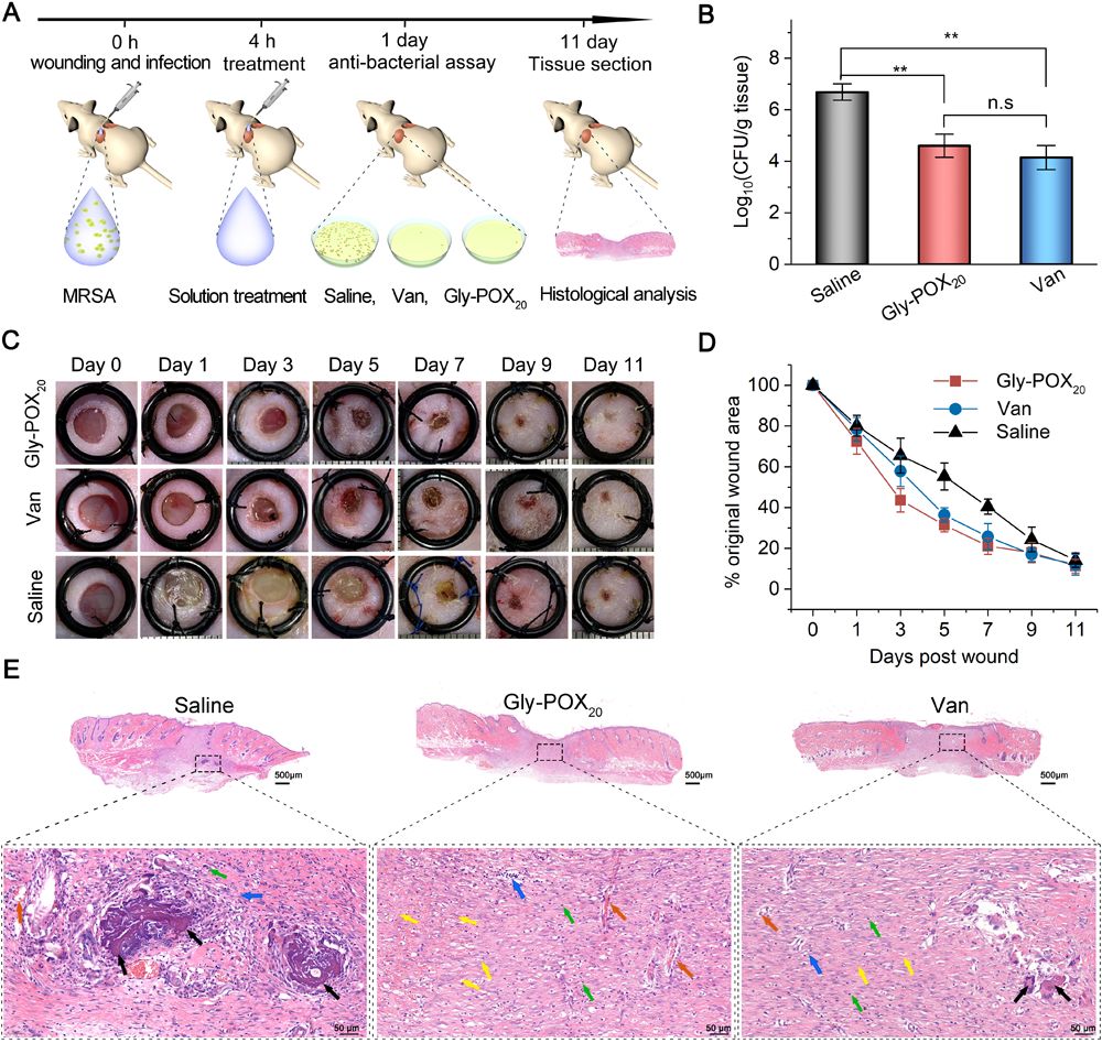 图4. In vivo antibacterial efficacy study using a rat full-thickness wound model of MRSA infection. (A) Description of the in vivo infectious animal model using S. aureus USA300 LAC. (B) Cell density of S. aureus in infected tissues on day 1 after treatment with 250 MIC Gly-POX20 and vancomycin (Van). ** p<0.01. (C) Infected wound photographs at defined time points showing representative result from 6 individual animals in each group. (D) Wound closure analysis expressed relative to the original size of the wound at day 0. Data are presented as the mean (n ≥ 3 in each group). (E) Histological analysis on wound tissue sections stained with H&E on day 11 after antimicrobial treatment (blue arrow: inflammatory cells; green arrow: fibroblasts; yellow arrow: new collagen; orange arrow: new blood vessels; black arrow: calcareous clumps along with multicellular macrophages).