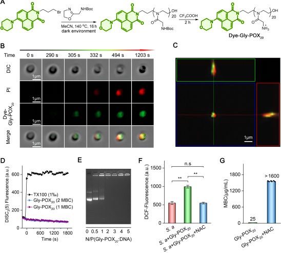 图3. (A) Synthesis of morpholino-naphthalimide dye conjugated Gly-POX20 (Dye-Gly-POX20). (B) Time-laps fluorescent confocal imaging on the interaction between S. aureus and Dye-Gly-POX20 (at 1×MBC) in the presence of propidium iodide. (C) Ortho view of Z-stack images on S. aureus after incubation with Dye-Gly-POX20 (at 1×MBC) for 1260s. (D) Gly-POX20-induced S. aureus cytoplasmic membrane depolarization assay. (E) The electrophoretic mobility shift assay of plasmid DNA and the mixture of plasmid DNA-complexes at different ratios of N:P (Gly-POX20:DNA). (F) Intracellular ROS intensity produced by S. aureus in the presence of PBS, Gly-POX20 (at 1×MBC), and the mixture of Gly-POX20 (1×MBC) and NAC (10 mM). ** p<0.01. (G) MBC value of Gly-POX20 against S. aureus in the presence or absence of NAC (10 mM).