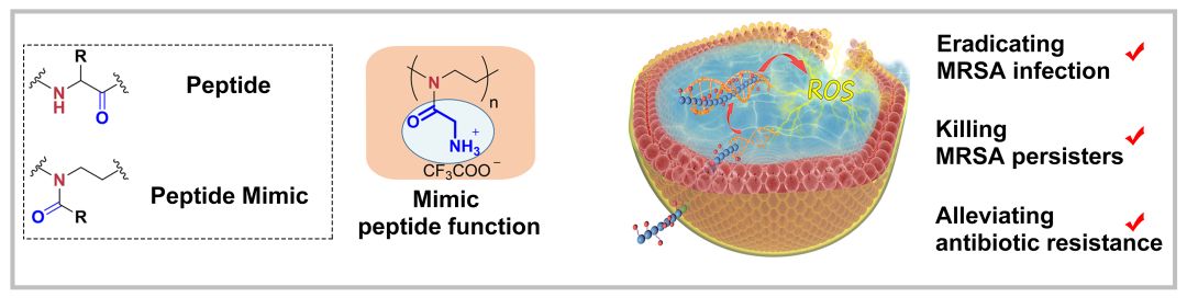 刘润辉教授课题组通过聚恶唑啉实现了多肽功能模拟,展示了一种新类型的多肽模拟物,在多肽模拟相关的多个领域有广阔的研究潜力;首次实现了基于聚恶唑啉的宿主防御肽模拟,开创了新的研究方向和思路,有望用于解决耐药微生物感染这一全球性的严峻挑战。该研究成果以题为“Poly(2-Oxazoline) Based Functional Mimics of Peptides to Eradicate MRSA Infections and Persisters While Alleviating Antimicrobial Resistance” 发表在《德国应用化学》(Angewandte Chemie International Edition),并被选为VIP论文。
