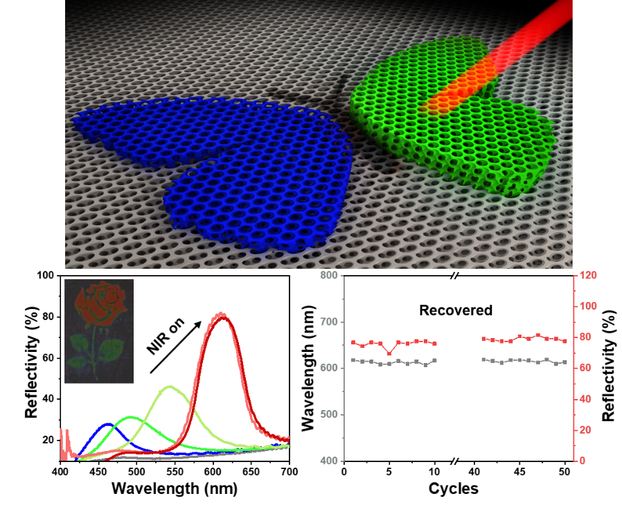 研究团队将光子晶体反蛋白石多孔结构设计到共价交联的聚苯乙烯/聚丙烯酸正丁酯形状记忆材料中,得益于聚苯乙烯/聚丙烯酸正丁酯形状记忆材料较宽的玻璃化转变温度(从47~105 ℃),该材料可拥有多个临时形状,且均能在室温稳定维持。采用近红外光照射(光热效应),即可实现形状记忆光子晶体材料临时形状在纳米尺度上的快速精准回复,由此改变光子晶体晶格间距,从而带来肉眼可见的颜色变化。而且,通过改变光照时间便可控制形状回复程度,进而可以程控颜色变化。值得强调的是,利用近红外激光可在同一张形状记忆光子晶体薄膜上直写出多种色彩(红绿蓝等),在反复擦写50次以上仍保持优异性能;同时,利用激光还可以将A4纸上的黑色图案彩色复印到形状记忆光子晶体薄膜上,复印下来的信息可以在室温下稳定保持超过一年。