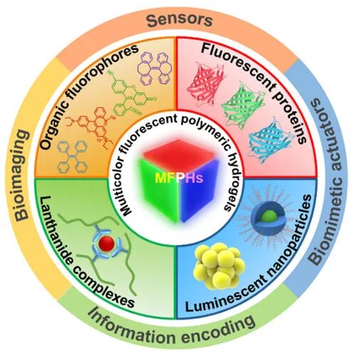 多色荧光高分子水凝胶其实广泛存在于自然界中,因为许多海洋软体动物以凝胶状态存在并显示动态发光的行为,用于伪装和交流。这些天然的多色荧光通常来自于荧光蛋白或天然荧光团。同样的,人工合成的多色荧光高分子水凝胶的设计通常是将两个或多个具有不同发光颜色的荧光团加入到同一水凝胶体系中。另外,通过设计和引入一些具有刺激响应颜色变化性能的荧光团可以获得基于单一发光中心的智能多色荧光高分子水凝胶。到目前为止,许多类型的天然或人工合成的荧光团都可以用来设计和制备多色荧光高分子水凝胶。根据荧光基团的类型可以分为荧光蛋白、有机荧光团、镧系复合物和发光纳米粒子四个大类。