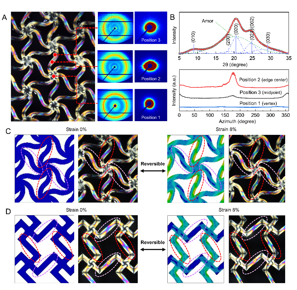 BSEISA-SFHs的结构和双折射特性。(A)BSEISA-SFHs的双折射图案和相应的内部结构监测。(B)WAXS的径向赤道强度曲线和SAXS的方位角曲线。(C和D)有限元分析模拟的应力分布和对应的BSEISA-SFHs的双折射条纹演变。左:应变0%,右:应变8%。