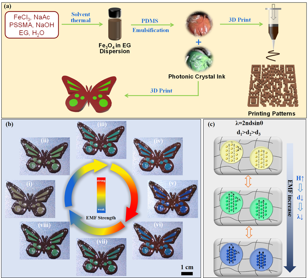 图2.(a)磁性光子晶体油墨的制备路线及3D打印二维码和双色蝴蝶图案的示意图,(b)使用两种不同的光子晶体油墨3D打印的蝴蝶图案在不同磁场强度下的循环变色照片,(c)光子晶体油墨及固化后的器件结构色调控的微观原理示意图