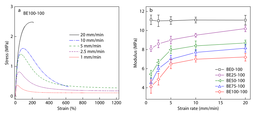 “固体-液体”材料("solid-liquid" materials)是指室温下在低形变速率下能表现为高粘度液体而在高形变速率下表现为弹性固体的一类材料,在人造皮肤、柔性电子器件、电池电极粘结层、多功能传感器等领域有重要的应用。但目前绝大部分“固体-液体”材料主要是基于聚硼硅氧烷(PBS)结构中硼-氧配位键的动态可逆断裂与结合,这种非共价键作用使得材料通常表现为较低的力学强度,限制了其实际应用。基于可逆动态共价键的类玻璃体(vitrimer)往往具有较高的模量,并且在各种外界的刺激下,聚合物网络能够重新排列,但其“固体-液体”性质却鲜有报道,尚未被仔细研究。