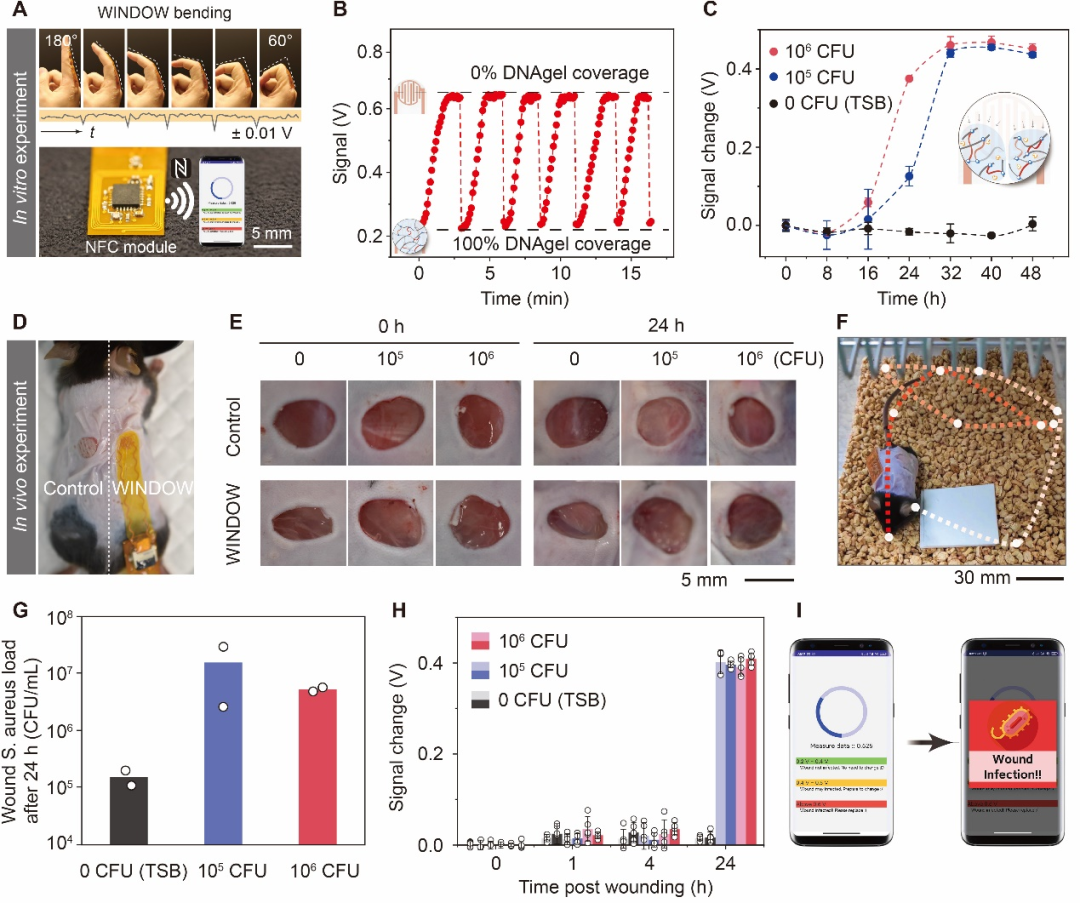 术后创伤管理直接关系着患者的康复速度。由致病菌(例如金黄色葡萄球菌)造成的伤口感染是阻碍伤口愈合甚至最终导致患者截肢的重要原因。以美国为例,术后伤口感染每年给医疗系统造成约30到100亿美元的额外开支。因此及时发现并处理早期伤口感染对于提升康复质量、降低医疗负担至关重要。临床上,伤口感染的判断通常依赖于专业人员对伤口的观察或伤口微生物取样培养。这两种方法都有一定滞后性且需要移除伤口的包扎敷料,这不可避免地会对伤口正常愈合造成干扰并给患者带来额外痛苦。无线、柔性生物电子器件具有连续、长期监测能力和与伤口组织的良好适应性。近年来,基于无线、柔性设计,研究者们已开发了一系列针对伤口pH、温度、湿度等生理指标的传感器。然而,这些指标多数只能间接反应伤口致病菌的定殖和入侵情况。有鉴于此,新加坡国立大学电气与计算机工程学院熊泽博士与John S. Ho教授团队紧密合作,开发了一种基于生物活性DNA水凝胶的无线、柔性伤口感染监测器件(WINDOW)。该器件能够方便地置于伤口和包扎敷料之间,通过智能手机近场通讯技术为病人或护理人员提供动态、连续的伤口致病菌活动信息,实现感染的早期预警、早期处理。