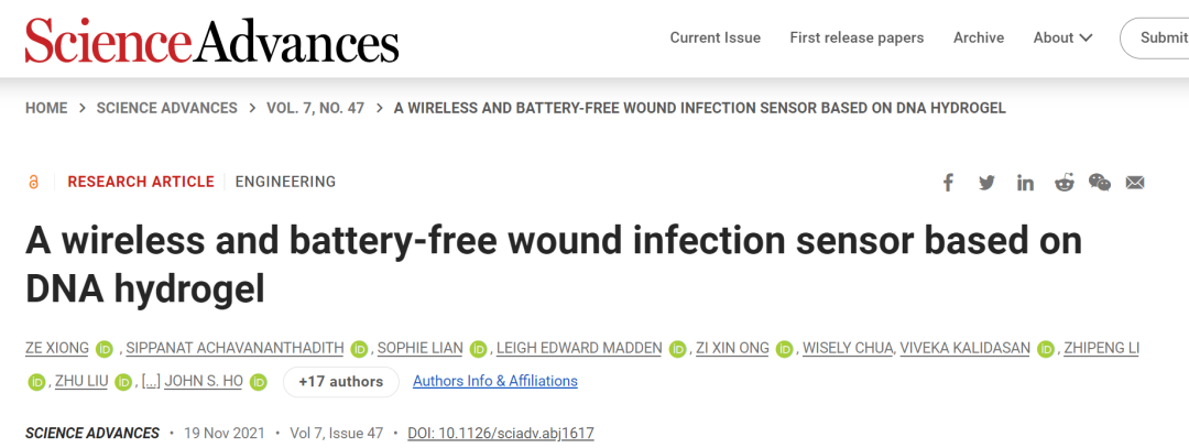 该工作以 A wireless and battery-free wound infection sensor based on DNA hydrogel为题发表在Science Advances上。新加坡国立大学电气与计算机工程学院熊泽研究员为该论文第一作者并和John S. Ho教授作为共同通讯作者。John S. Ho教授建立的无线生物电子实验室近年来开发了一系列基于无线技术的可应用于体、内外的新型生物电子器件并多次在Nat. Biomed. Eng.,Nat. Electron.,Sci. Adv.,Nat. Comm.等期刊上发表相关工作。