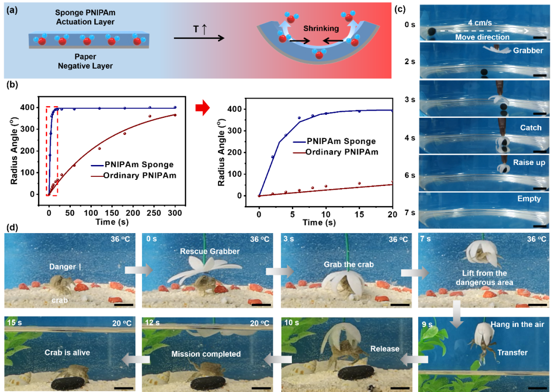 Figure 2. 温度响应凝胶海绵驱动器快速抓取运动物体