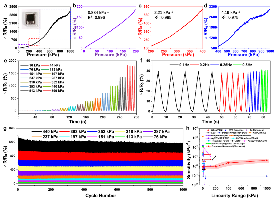 随着社会经济的发展以及人口结构的改变,人们对于生理信号监测的需求日渐加深。各大厂商纷纷推出各种可穿戴电子设备。人体无时不刻不在产生各种生理信号,在各种生理信号监测中,压力传感器在脉搏、呼吸、触觉等信号中扮演了重要的角色。但是,现有的传感器大部分为负电阻式传感器,即器件电阻随着压力的增大而减小,使得电阻变化小于100%,限制了传感器的量程与灵敏度。另一方面,柔性传感器由于材料性能,在大压强情况下存在稳定性不足的问题。为了解决上述问题,周建华团队与任天令团队借鉴钢筋混凝土结构,使用纳米织物作为骨架,通过激光直写的方式在其中嵌入多孔石墨烯结构限制传感器中裂纹的产生与扩展,极大提高了传感器的量程与灵敏度等参数,以纳米织物增强石墨烯作为核心材料实现超大量程(1000 kPa),超宽线性范围(1000 kPa),高灵敏度(4.19 kPa-1),高稳定性(>10000次循环)的NRGPS。