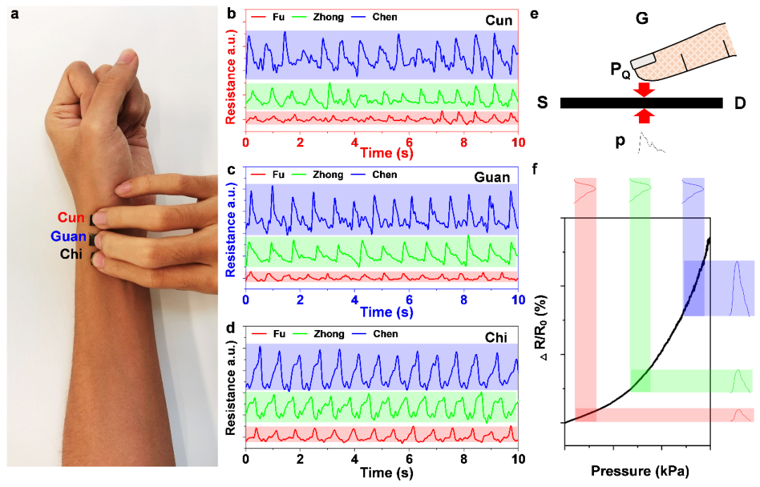 NRGPS在硬件与软件两个方面都具有智能特性。通过模拟MOSFET的信号放大特性,将NRGPS压力受力端视为力学栅极,通过调节所施加压力改变静态工作点可以实现微小力学信号的原位放大。基于NRGPS原位信号放大的功能,周建华团队与任天令团队实现了中医脉诊中浮中沉三种压力情况下的脉搏信号提取。并且由于NRGPS高超薄特性,脉诊过程中传感器并不会影响手感。