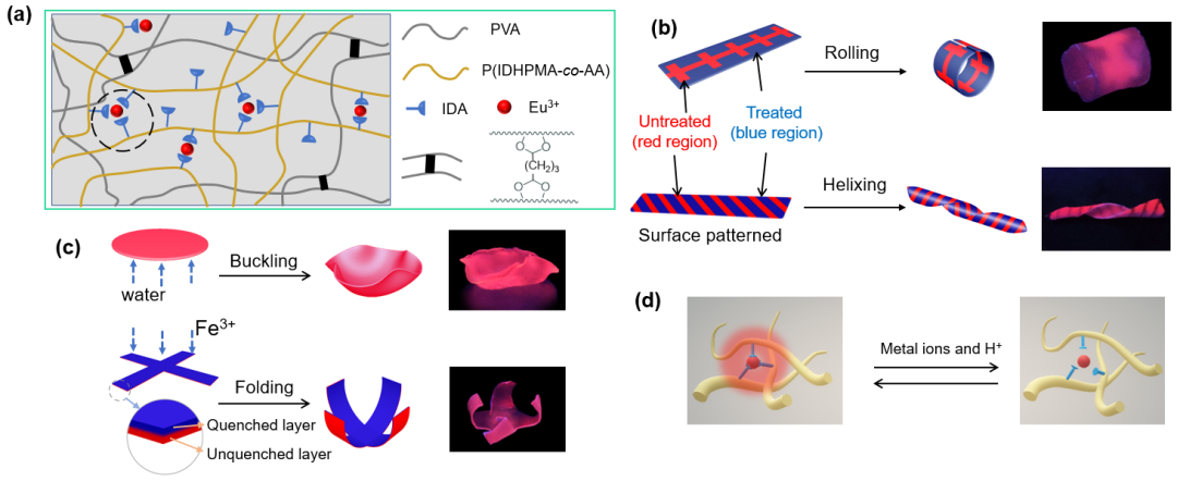 图1.聚合物薄膜网络结构设计(a)及基于聚合物薄膜铁离子溶液平面内图案化(b)以及厚度梯度的铁离子/水份扩散(c)的3D自成形;(d)Eu-IDA在竞争性金属离子与H+作用下的络合与解络合示意图。