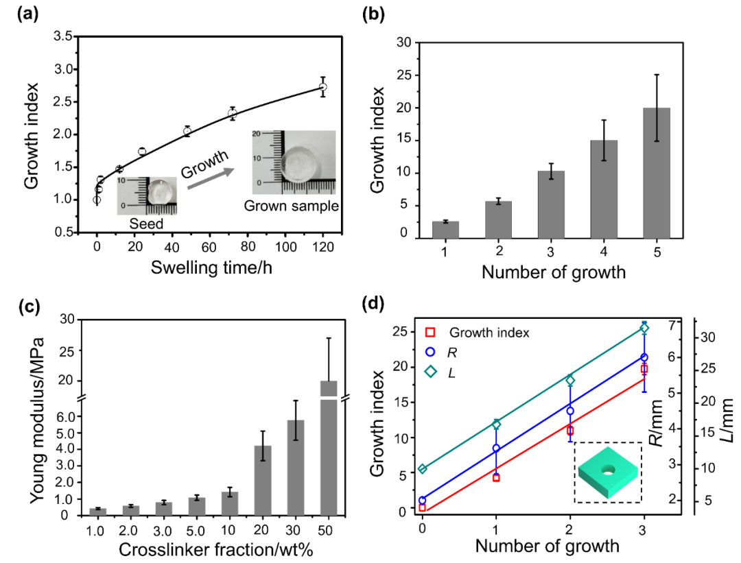 图2、在生长过程中控制基于PHBA样品的结构参数和特性。(a)在不同膨胀时间所得的样品的生长指数。(b)在不同生长周期所得的样品的生长指数。(c)从含有不同交联剂浓度的营养液中生长的样品的杨氏模量。(d)中间圆孔立方体样品在不同生长周期的生长指数和参数变化。