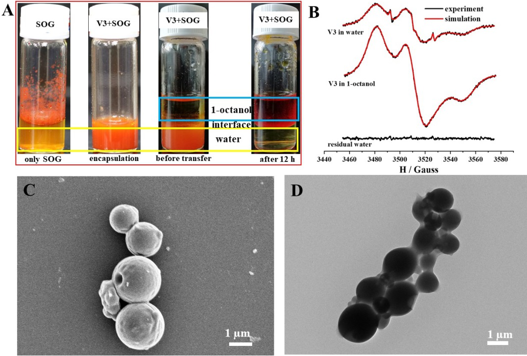 Figure 2. A) Encapsulation and transformation of V3 from aqueous solution (polar, low viscous) to 1-octanol (non-polar, high viscous); B) EPR spectra of V3 before (in aqueous solution) and after (in 1-octanol and residual aqueous solution after 12 h, respectively) the transformation and C) SEM and D) TEM images of reverse V3 in 1-octanol after transformation