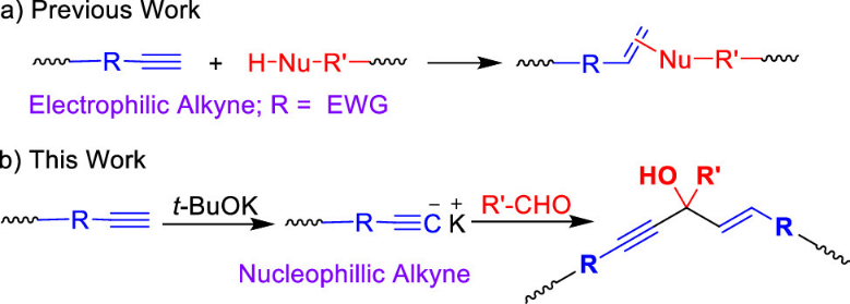 华南理工大学唐本忠院士团队秦安军教授课题组一直致力于新型炔类单体的聚合反应研究,例如,发展了亲核单体——胺或醇与活化炔类单体的聚合,即自发的胺-炔点击聚合(J. Am. Chem. Soc. 2017, 139, 5437; Sci. China Chem. 2019, 62, 1198; Macromolecules, 2019, 52, 4526; Macromolecules, 2020, 53, 2516)以及有机碱催化的羟基-炔点击聚合反应(Chem.-Eur. J. 2017, 23, 10725; Polym. Chem. 2020, 11, 2568; J. Am. Chem. Soc. 2022, 144, 1672)等。在这些工作中,吸电子基团的引入,有效地提高了炔烃单体的亲电性,增强了这些单体与亲核单体的反应活性(图1a)。