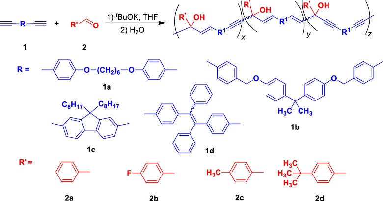 图1. 炔类单体的亲电(a)和亲核(b)聚合示意图除亲电性外,炔基还具有亲核性。最近,作者利用末端炔烃在碱性条件下可以形成亲核炔化物的特性,成功发展了碱作用的末端炔类单体与芳香醛的聚合反应(图1b)。在叔丁醇钾的作用下,双官能度末端炔类单体与芳香醛单体可高效发生串联聚合,高立体选择性、高产率(最高可达93%)地制备了一系列高分子量、仅含E-式异构体的聚合物(图2)。所得聚合物具有良好的溶解,可通过简单的溶剂挥发法得到自支撑薄膜(图3)。![]()