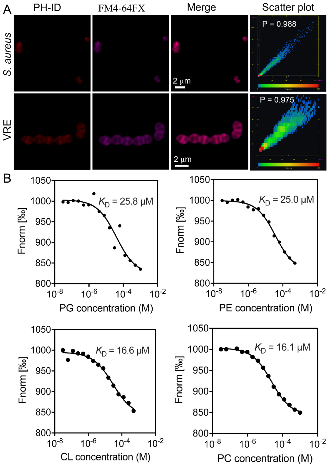 图3.(A)PH-ID与细菌膜商业染料共染荧光图。(B)微量热泳动(MST)测定PH-ID与细菌质膜膜磷脂成分的亲和力。膜靶向是AIE材料抗菌治疗和细胞成像的重要机制,但AIE材料对细菌的特异性靶向机制尚不清晰。进一步探究PH-ID分子与细菌结合的潜在靶标,利用MST测试PH-ID与细菌质膜的磷脂酰甘油(PG),磷脂酰乙醇胺(PE),心磷脂(CL)和哺乳动物细胞膜的磷脂磷脂酰胆碱(PC)的亲和力。PH-ID对PG、PE、CL、PC均表现出高亲和力,平衡解离常数(KD)分别为25.8、25.0、16.6和16.1 μmol/L(图3B)。结果表明电中性的PH-ID主要通过疏水作用结合质膜磷脂分子。对于革兰阴性菌,其疏水屏障外膜可阻碍高疏水性的化合物进入细菌。PH-ID具有高疏水性(cLogP = 5.50),推测革兰阴性菌外膜阻碍了PH-ID与质膜表面磷脂结合。通过CRISPR基因编辑及突变诱导等生物学试验,构建LPS缺陷鲍曼不动杆菌,PH-ID成功染色LPS缺失鲍曼不动杆菌,说明革兰阴性菌的LPS是PH-ID对革兰阳性菌特异性的原因。因此,AIE分子PH-ID是膜靶向抗菌候选物的潜在来源,是阐明膜靶向抗菌作用机制的有效模式分子。研究结果为膜靶向AIEgens合理设计和高效利用提供理论依据。