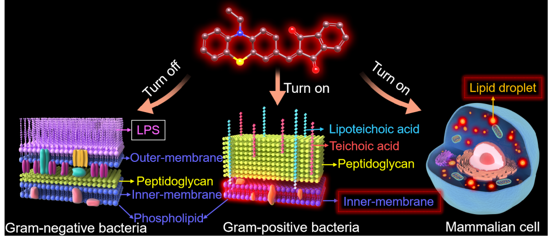 图1. PH-ID对革兰氏阳性菌特异性成像机制示意图。细菌主要分为革兰氏阳性菌(G+)和革兰氏阴性菌(G-)两大类,为实现快速筛选革兰氏阳性菌和阴性菌,提高临床药物治疗有效性,广东工业大学冯星副教授与广州医科大学李莹教授、香港中文大学(深圳)唐本忠院士团队开发了一种电荷中性、特异性脂滴成像的红光聚集诱导发光材料(PH-ID),能够在10分钟内实现G+的特异性染色和成像,成功染色的G+发出红色的荧光且肉眼可见,而PH-ID未对G-染色(图1)。本研究不但提供了一种新型的红光AIE材料,可实现对阴性/阳性细菌的高效区分与准确筛选,为临床细菌监控提供新策略,而且通过深入阐明PH-ID对G+选择性成像机制,为AIEgens合理设计和高效利用提供理论依据,为新型抗菌药物创制提供技术手段和骨架结构。该工作以“Lipid Droplet-Specific Red Aggregation-Induced Emission Luminogens: Fast Light-Up of Gram-Positive Pathogens for Identification of Bacteria”为题发表在《ACS Materials Letters》上(ACS Materials Lett. 2022, 4, 1523−1530)。文章第一作者是广东工业大学硕士研究生王晓慧和中国农业大学博士后宋玫蓉。该研究得到深圳大学王东教授和中国农业大学朱奎教授的帮助,以及国家自然科学基金委、广东省自然科学基金委、广东工业大学“青年百人计划”的支持。![]()
